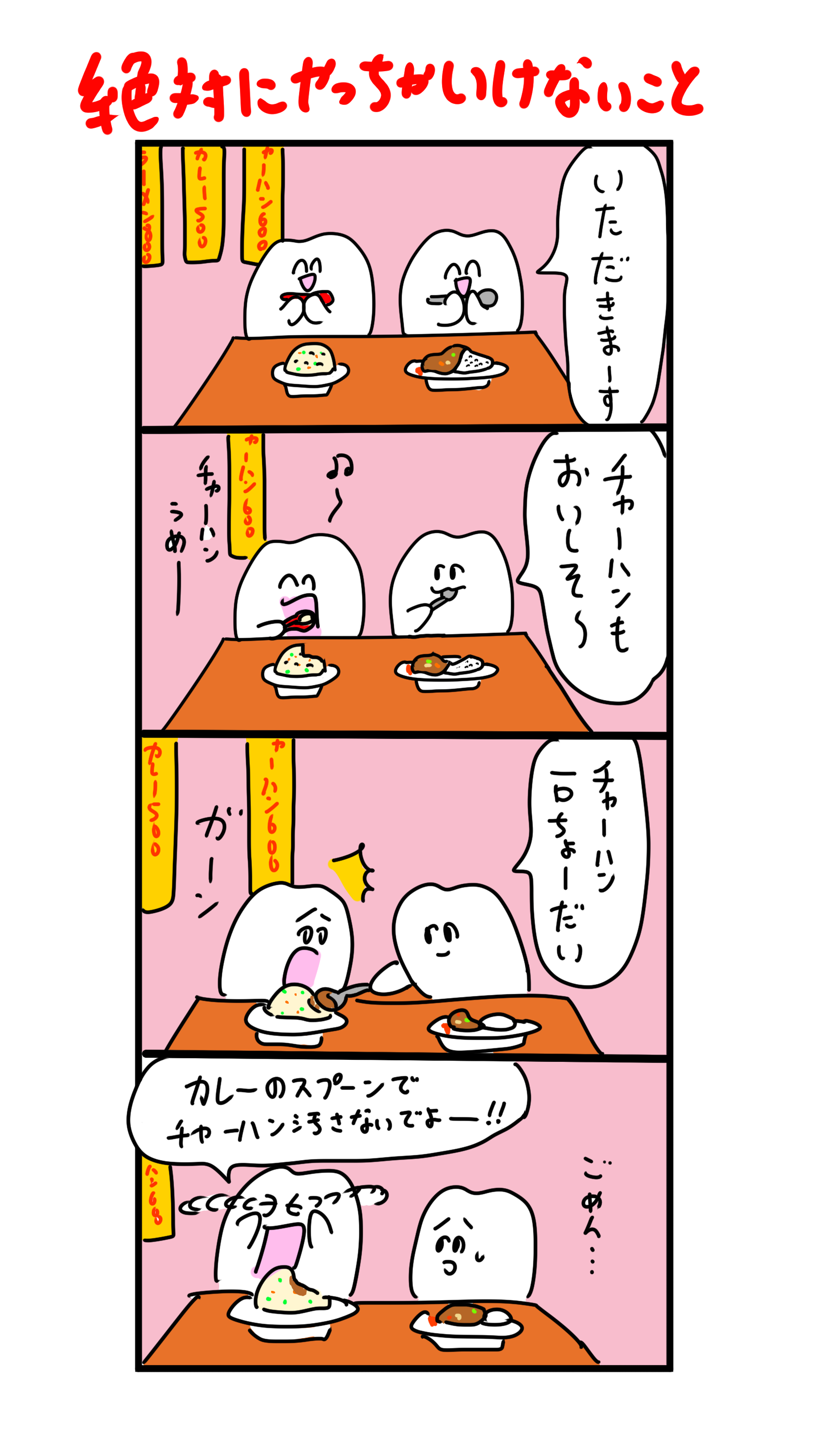 カレーのスプーンでチャーハン汚さないで! 2022年10月31日 俺のチャーハンまっちゃっちゃ↓やっちゃいけないこと繋がりでこちらも是非 ↓良かったらポチッと押してもらえるとやる気が出ます。 ... 続きを読む 俺のチャーハンまっちゃっちゃ↓やっちゃいけないこと繋がりでこちらも是非 ↓良かったらポチッと押してもらえるとやる気が出ます。