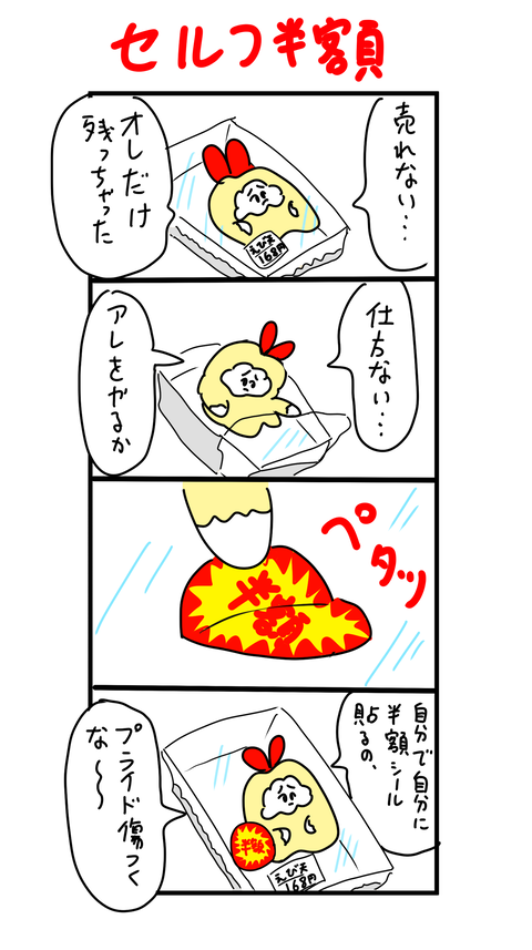 自分で自分に半額を 2022年10月23日 かわいそうなえび天↓良かったらポチッと押してもらえるとやる気が出ます。 ... 続きを読む かわいそうなえび天↓良かったらポチッと押してもらえるとやる気が出ます。